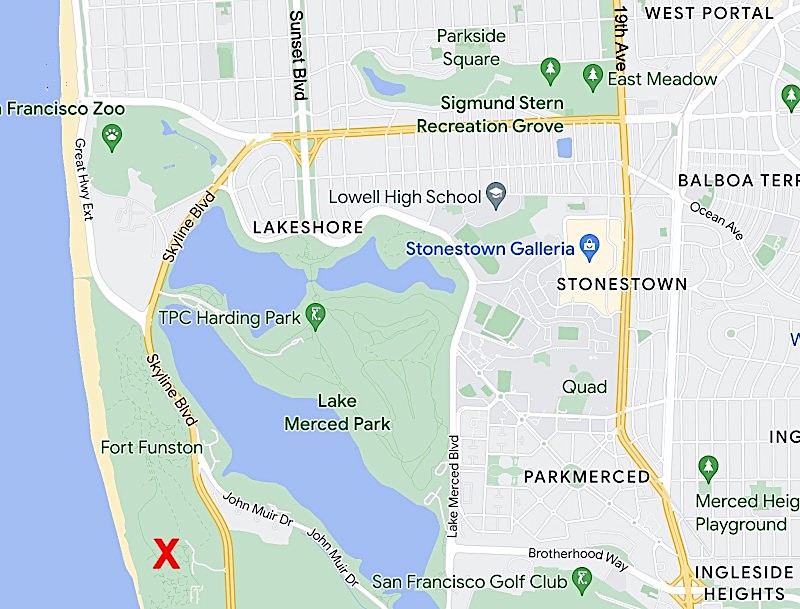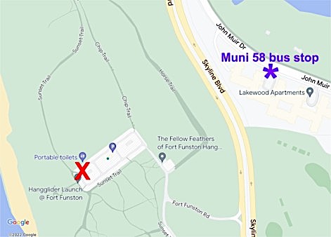Continuing AASCEND‘s tradition of enjoyable walks together (while we await a return to our pandemic-closed meeting space), on Saturday November 19th we’ll explore Ft Funston, in the southwest corner of San Francisco. This will be a pleasant and easy walk in a beautiful seaside location. We’ll convene at 11am in the parking lot by the hang-glider launch point (X on the maps, here’s a map link). The Muni 58 bus stops at Lakewood Apartments across Skyline Blvd (be careful when crossing). We plan to sit down to eat together at the Lake Merced picnic tables, so bring a lunch. The weather looks to be partly sunny with highs in the low 60’s and ocean breezes. Dress accordingly. It will be great to see each other in person again and to have a chance to talk and catch up! Newcomers are welcome.